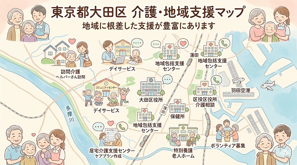 大田区にお住まいの方、または近隣の品川区、川崎市との境界地域で介護されている方のために、利用可能な公的サービスと専門窓口をご紹介します。