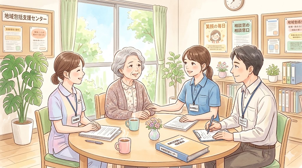 地域包括支援センターは、高齢者の皆様が住み慣れた地域で安心して生活できるよう、保健師や社会福祉士、主任ケアマネジャーなどの専門職が連携して支援を行う「総合相談窓口」です。